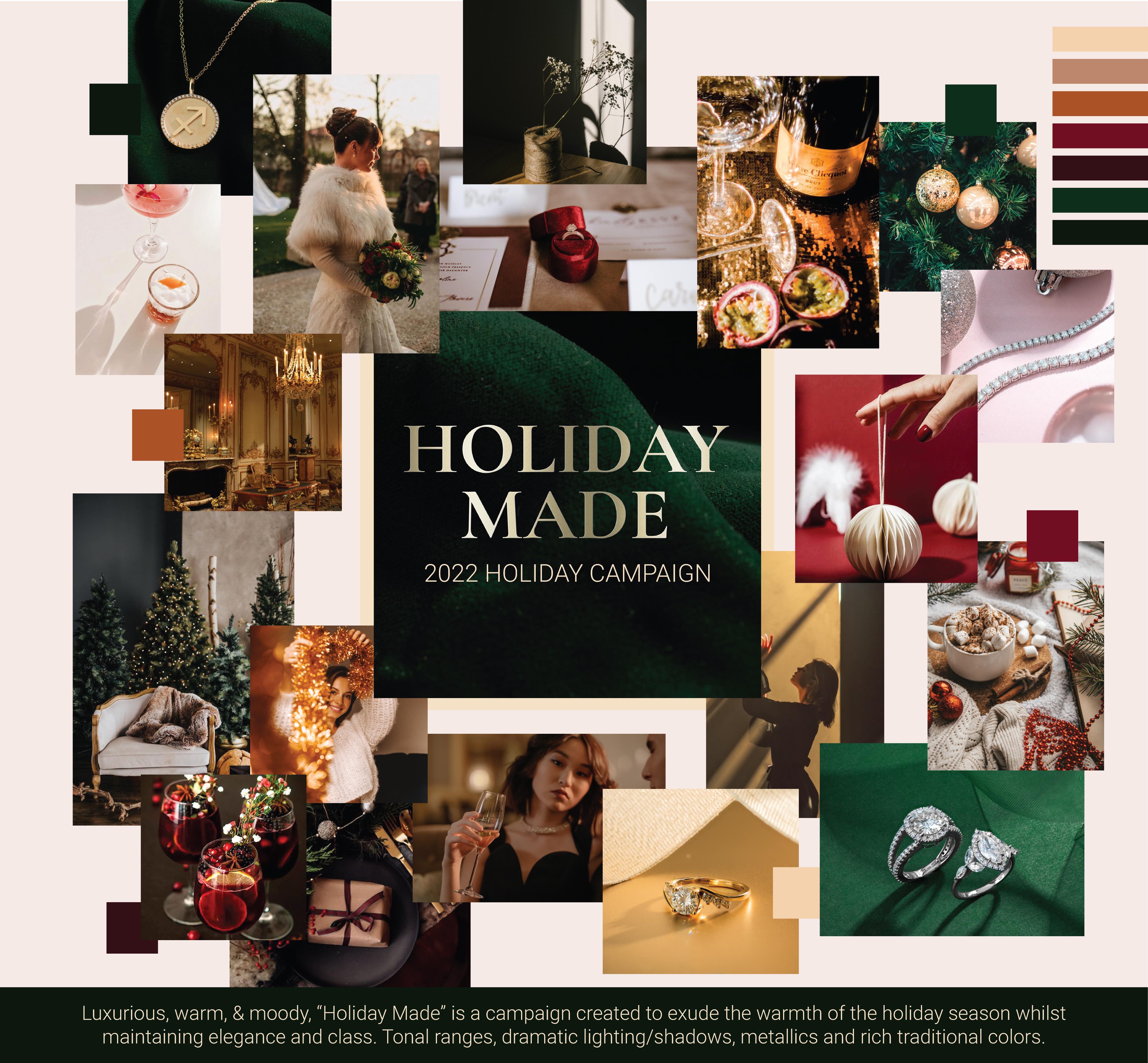 Above is the holiday moodboard I created for our Holiday 2022 campaign. I wanted to convey a luxe and warm traditional holiday feel, and this is the palette/mood that I built that both the photographers and videographers referenced for supporting collateral. I also storyboarded for video ads, worked on type animations for video ads, and collaborated directly with photographers, the junior designer, and senior copywriter to create all collateral.