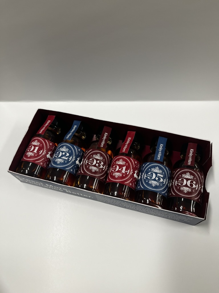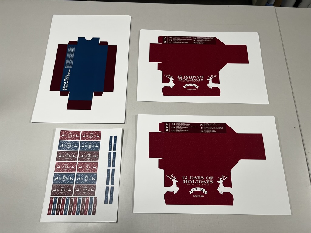 Working with only 12×18″ 130lb. paper and label paper that we had in-house, I engineered a whole set of packaging that included bottle labels, tack strips, two sets of boxes (set 1-6, and set 7-12 to create the “12 Days of Holidays”), and a belly band to hold the whole set together.